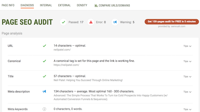 The diagnosis report breaks down on-page SEO elements on any given page.