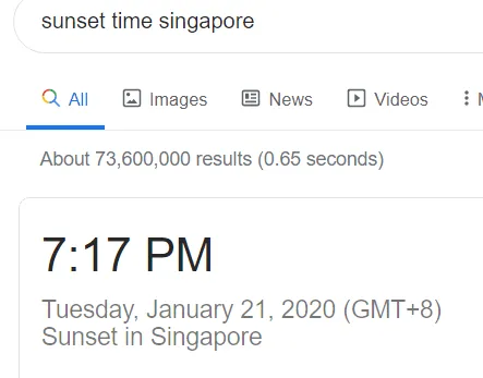 Want to find the time that the sun rises or sets in your area? Simply search for sunset time or sunrise time . You can also search for specific locations. For example, sunset time Singapore will tell you the expected time of sunset in Singapore.