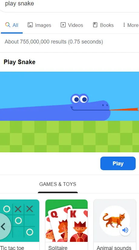 You can now find games to play directly within Google search results. The easiest way to get this feature to work is to search play snake . An in-search game of snake will be available for you to play immediately.
