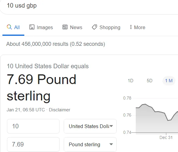 You can convert any currency value by typing your current value in your current currency, followed by another currency. For example 10 USD GBP will return a calculation for the current conversion for 10 US Dollars to Great British Pounds. Please note that this information is based on Morningstar and does not reflect the rates your bank may offer.