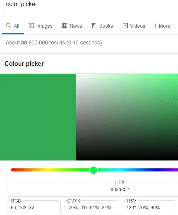 Whether you’re looking for the hex code for a specific color, or want to be able to convert hex into RGB, HMYK, HSV, or HSL, simply search for color picker in Google and a color picker tool will appear.