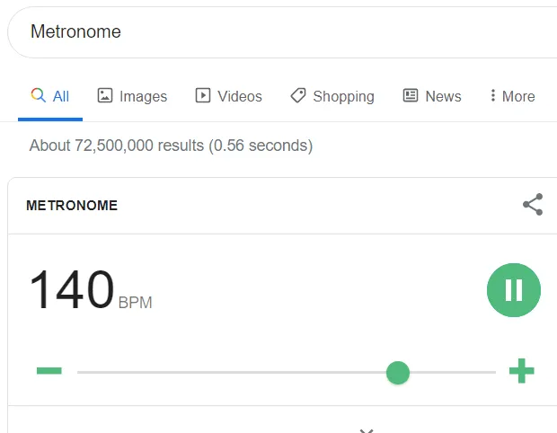 Google will let you create a metronome at any beat you select. All you must do is search Google for metronome , select your beats per minute, and then press play.