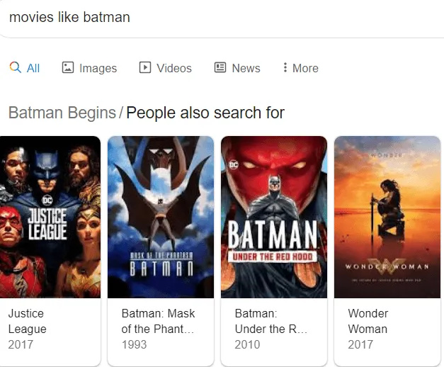 Want to find a movie, TV show, or song like your favorites? Simply type songs/shows/movies like batman into Google and you’ll get relevant results. Replace Batman with whatever song, show, or movie you like.