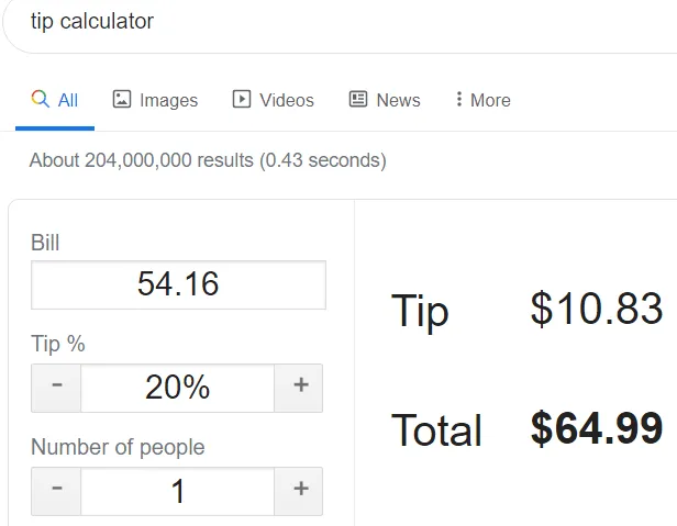 If you’re in a panic to calculate a tip for your waiter, search tip calculator on Google and a calculator will return. You can enter your bill total and then enter the percentage you’d like to tip.