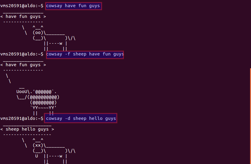 Various cowsay commands you can try are,