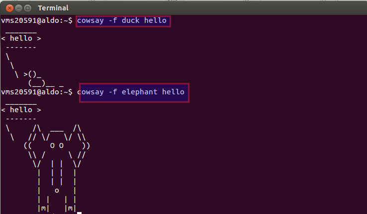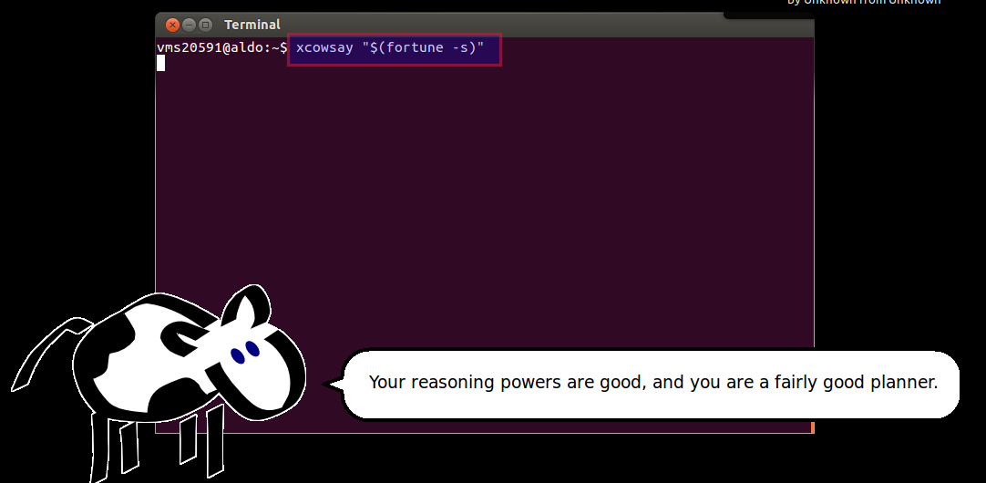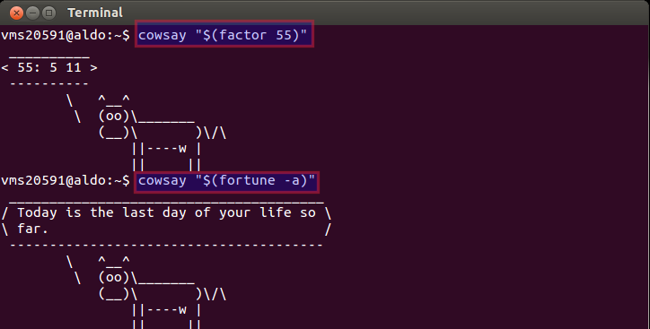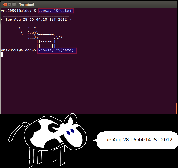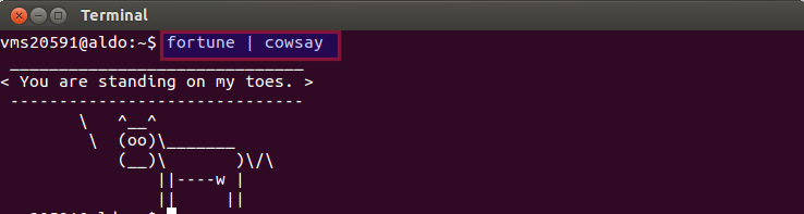 So far we have seen commands like cowsay, xcowsay, fortune, figlet, yes, factor, date&cal etc., but these commands can be combined to produce different effects.