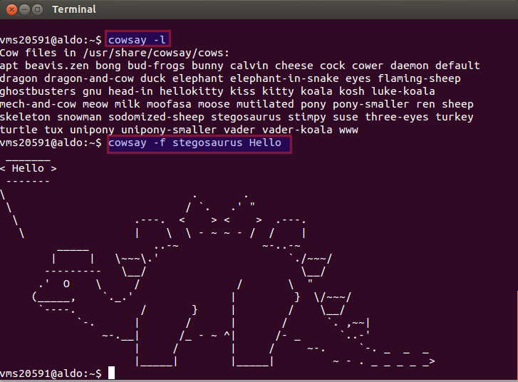 Cowsay is a fun command with which your input text is displayed by a cow (ASCII art generated) or any other animal of your wish.
