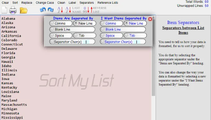 SortMyList offers advanced alphabetizing options, allowing users to sort A–Z with special recognition of names, addresses, titles, emails, HREFs, and more. Uniquely, SortMyList can also sort by day of the week and month if such text is detected.