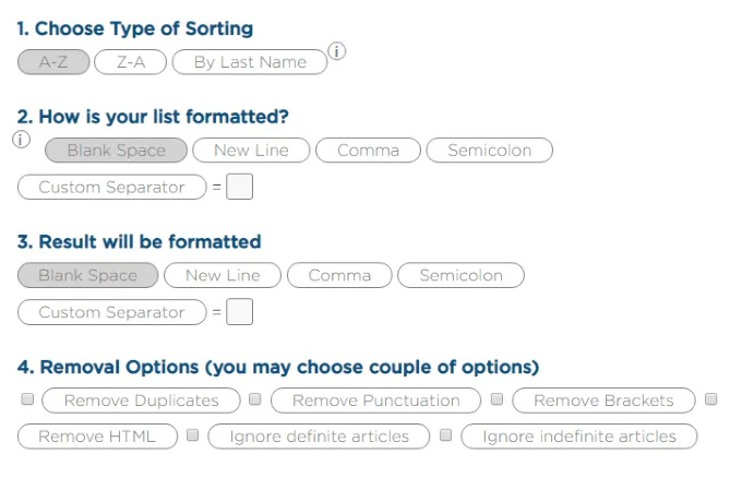 EduBirdie’s alphabetizer allows users to choose their type of sorting, either A–Z, Z–A, or by last name, as well as the input and output formatting: blank space, newline, comma, semicolon, or any custom delimiter.