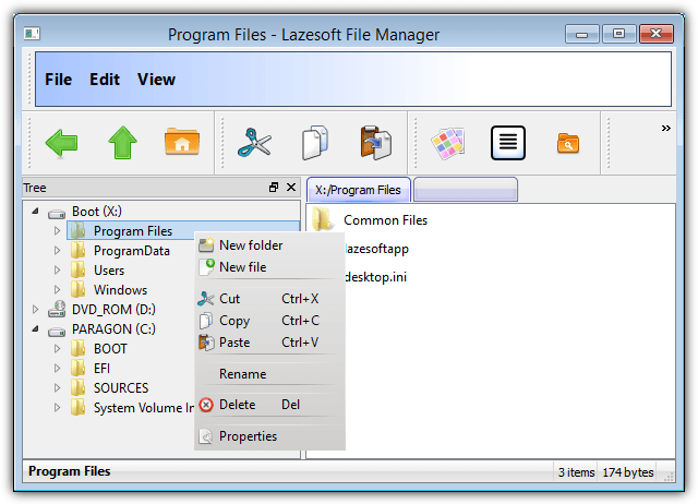 The Windows File Manager button found on the Lazesoft Recovery Suite Home Edition disc is not really a fully featured file manager like Windows Explorer where you have two tree view panes to easily manage files. You can however launch a third party file manager from the Windows Recovery button, go to the RepairTools tab and click on Lazesoft File Manager.