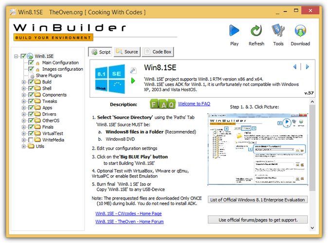 Additional Notes: You can build a WinPE 5.1 which is based on Windows 8.1 using the old WinBuilder 082 through Win8.1SE . You will need to download the Windows 8.1 enterprise evaluation ISO, extract it to your hard drive or mount the ISO to a drive letter, point the source directory to the extracted/mounted Windows 8.1 files, and click the Play button. Optionally, you can also change the configuration settings by enabling/disabling the scripts found at left hand navigation tree.