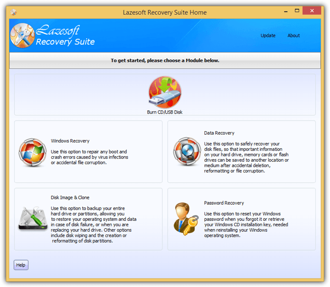 Lazesoft Recovery Suite Home Edition is free for non-commercial use only. It is able to create a Windows PE boot disc containing a few modules to help in recovering a crashed Windows by repairing boot errors, recover files after accidental deletion, cloning and creating disk image, recovering Windows serial number and resetting user account password.