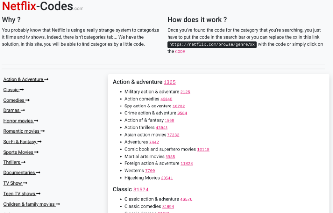 This site is the most eye-pleasing and organized way to check all the secret categories on Netflix. You get larger categories (for example: action and adventure, thriller, documentaries, comedies, etc.) as well as sub-categories in each (for example: martial arts movies, LGBT dramas, deep sea horror movies, military documentaries, etc.). The link is available right next to it, which you can click and browse in Netflix.