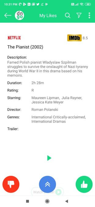 Dinggo asks you to select genres and sub-genres when you start. It’s a good idea to do this meticulously because otherwise, it will throw so many random and unwanted choices at you that you’ll be put off from using it. Once you start, it’s simple: swipe left to reject, swipe right to like. Swipe down to find more information about any movie or show, such as the description and ratings.