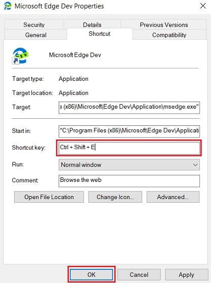 - You will find “Shortcut Key” in the Properties dialog. In the corresponding text field, press your choice of key combination and hit the “Ok” button.