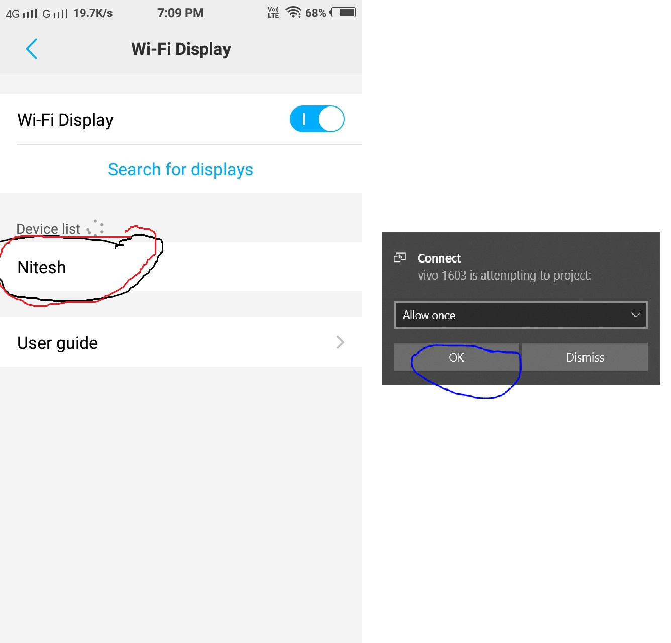 - You will see your PC name just tab and your PC will ask you to allow just click ok and your android screen will be mirrored.