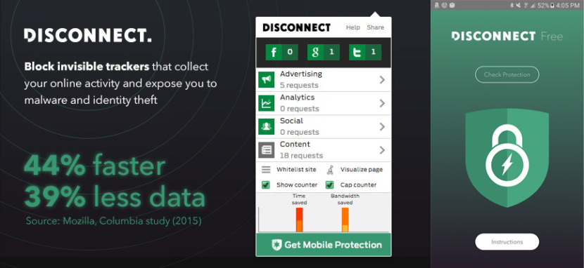 Their privacy policy, in a sentence: They don’t collect your IP address or any other personal info, except the info you volunteer. Make the web faster, more private, and more secure. Disconnect lets you visualize and block the invisible websites that track you. Load the pages you go to 44% faster. Stop tracking by thousands of third-party sites.