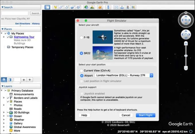 To play Flight Simulator, all you need is to launch Google Earth Pro and press Ctrl + Alt + A to launch the Flight Simulator window. It allows you to choose your aircraft and start location, as well as allowing you to control the simulator using a joystick.