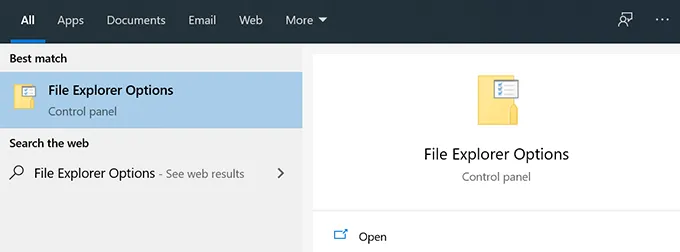 - Search for File Explorer Options in Cortana search and open it.