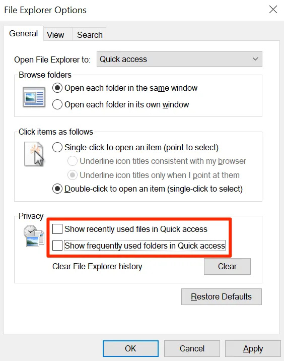 - There’ll be two checkboxes in the Privacy section named as Show recently used files in Quick access and Show frequently used folders in Quick access . You need to untick both of these boxes and click on Apply followed by OK .