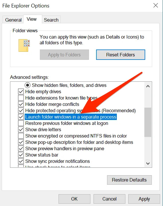 - You’ll see a number of options to enable and disable. Find the one that says Launch folder windows in a separate process and tick-mark it. Then click on Apply followed by OK .