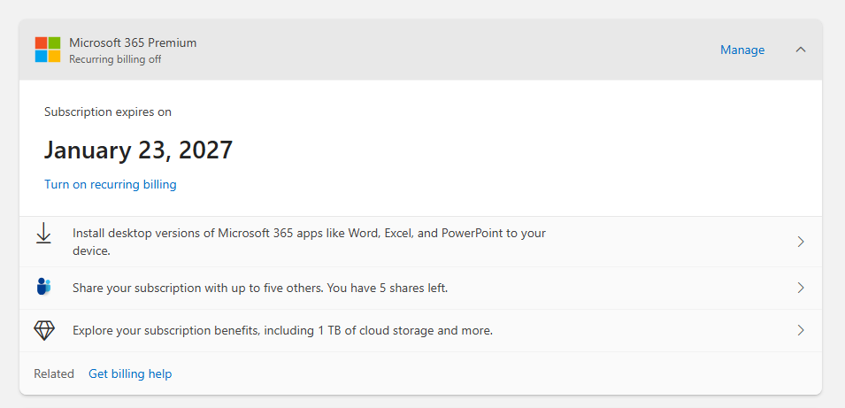 account.microsoft.com/services → Manage → Recurring billing OFF