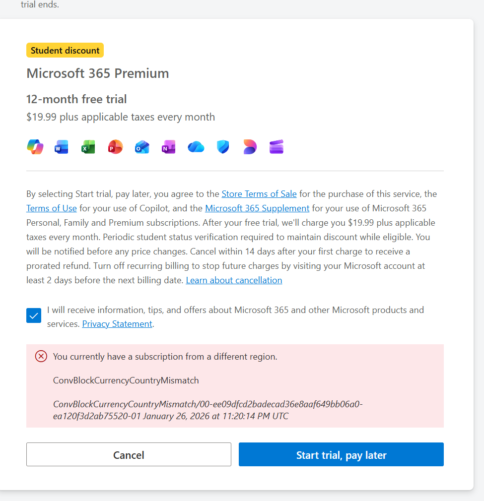 I had the same issue with this but I used gmail account which I created for us region only and use indian country card only and then it worked so if it is not working for you try to create an account in US region use a good vpn