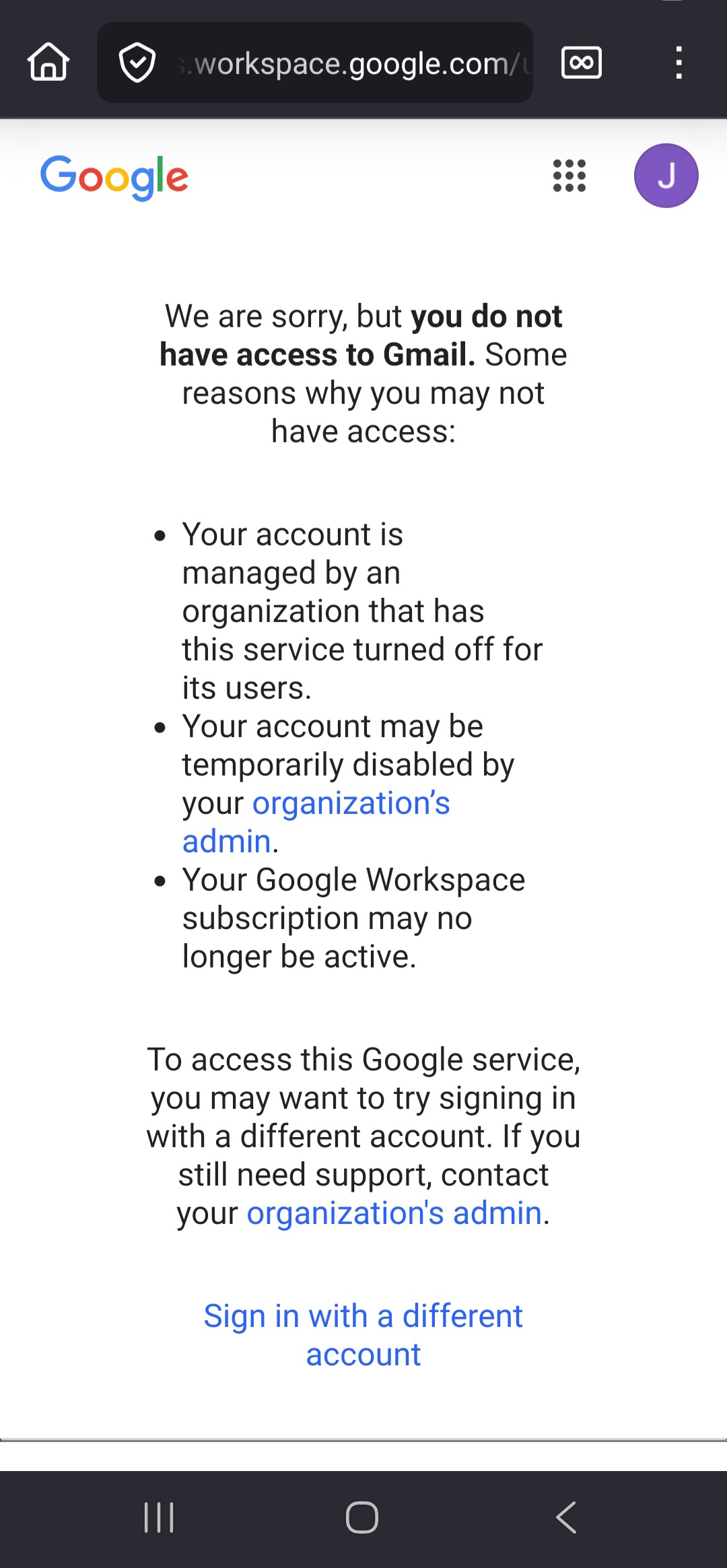 This screenshot here shows that no access to gmail of the edu email provided by maricopa