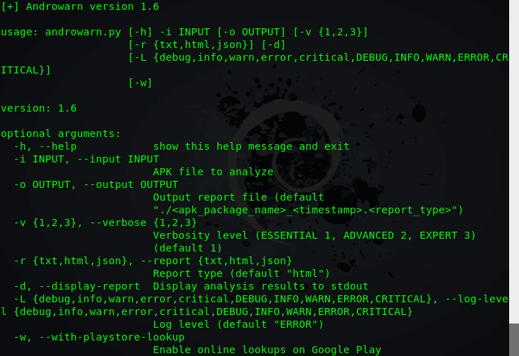 usage: androwarn [-h] -i INPUT [-o OUTPUT] [-v {1,2,3}] [-r {txt,html,json}]