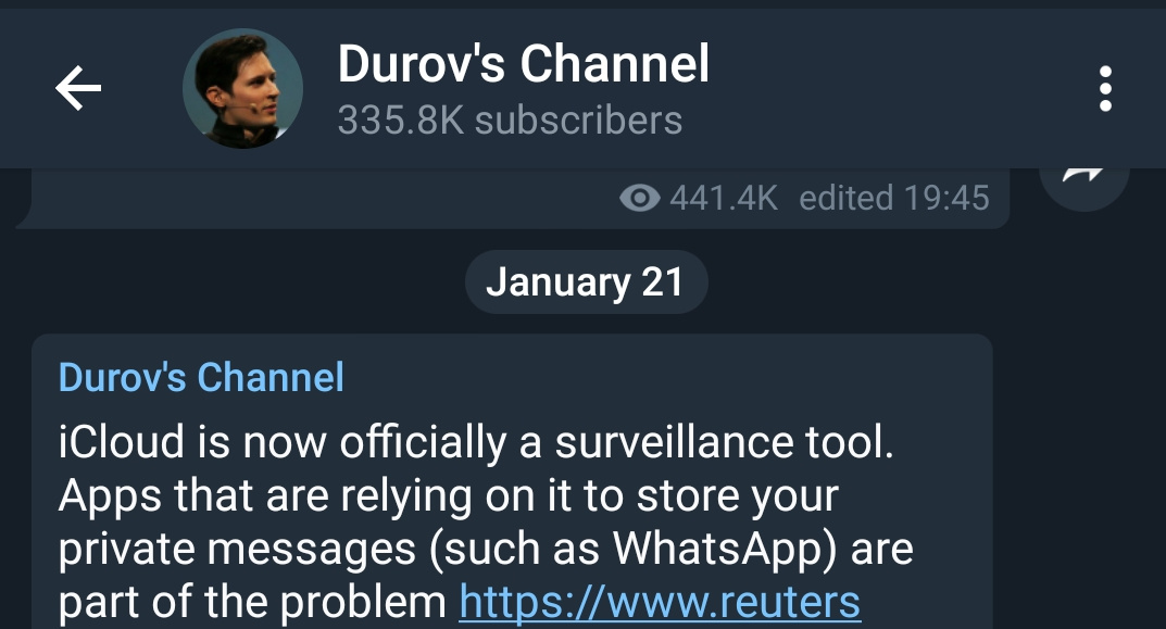 Telegram founder Pavel Durov said today that “Now icloud is an official Officially a Suvillence Tool, Apple that relying on it to Store your private Message including WhatsApp is part of the problem.”