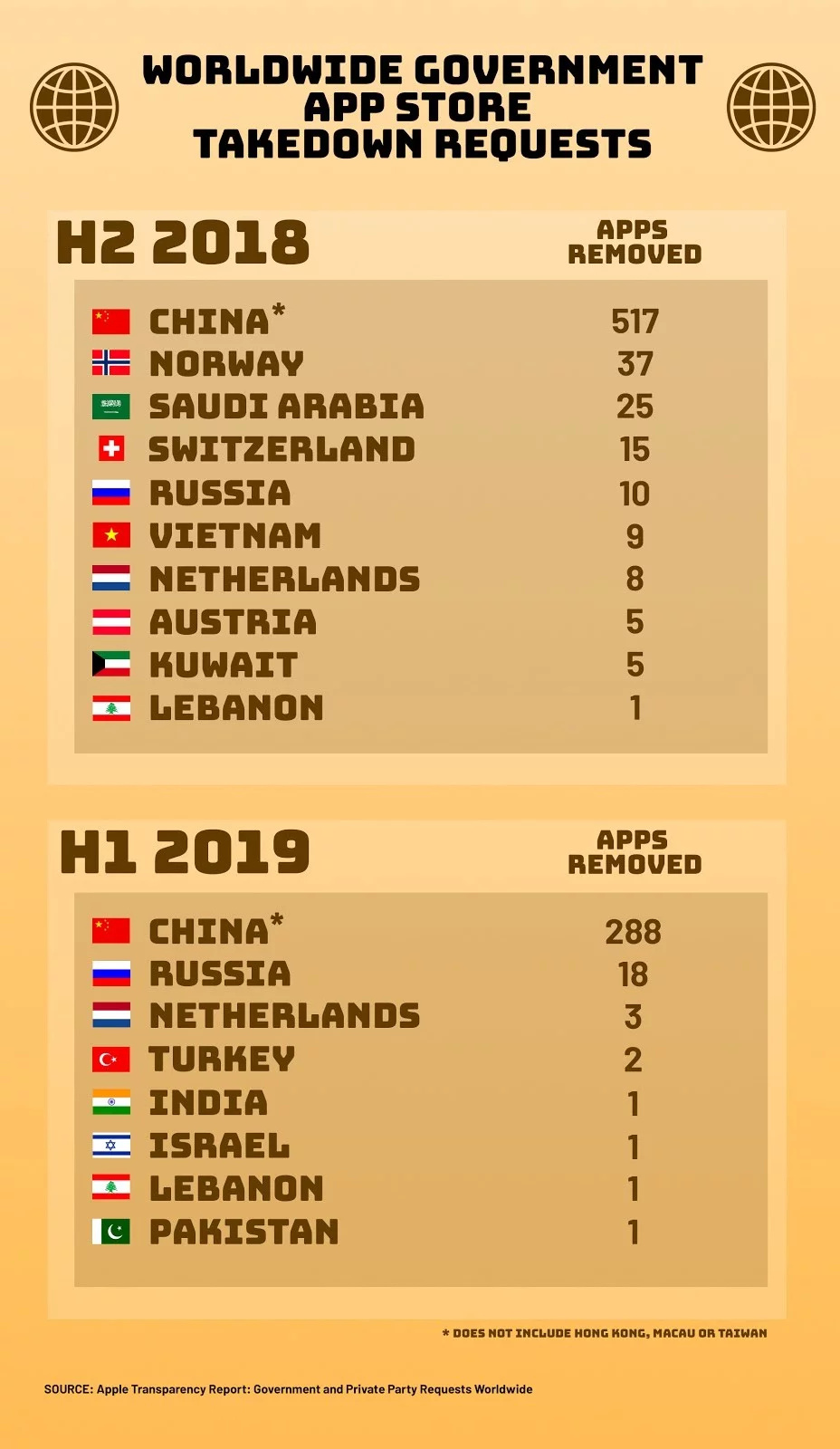 In Apple’s latest transparency report accounting for the first half of 2019, the iPhone maker said it removed 288 apps from China’s iOS App Store for both legal and policy violations. The Apple Transparency Report goes out twice a year and details requests received from government agencies and private parties worldwide. The report lists government requests to access information on accounts and devices, but the last two reports also include the number of apps Apple removed that period. When it comes to why those apps are removed, though, Apple is tight-lipped. The reports cite two reasons for app removals: Platform violations, which covers gambling apps (gambling is illegal in China), and legal violations, which according to Apple usually means apps with pornography (also illegal in China) and other illegal content.