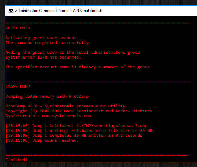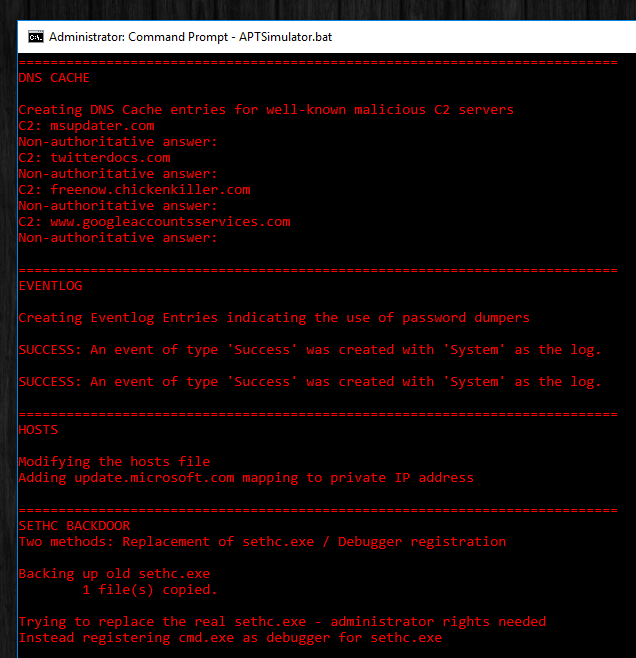 You don’t need to run a web server, database or any agents on set of virtual machines. Just download the prepared archive, extract and run the contained Batch file as Administrator. Running APT Simulator takes less than a minute of your time.