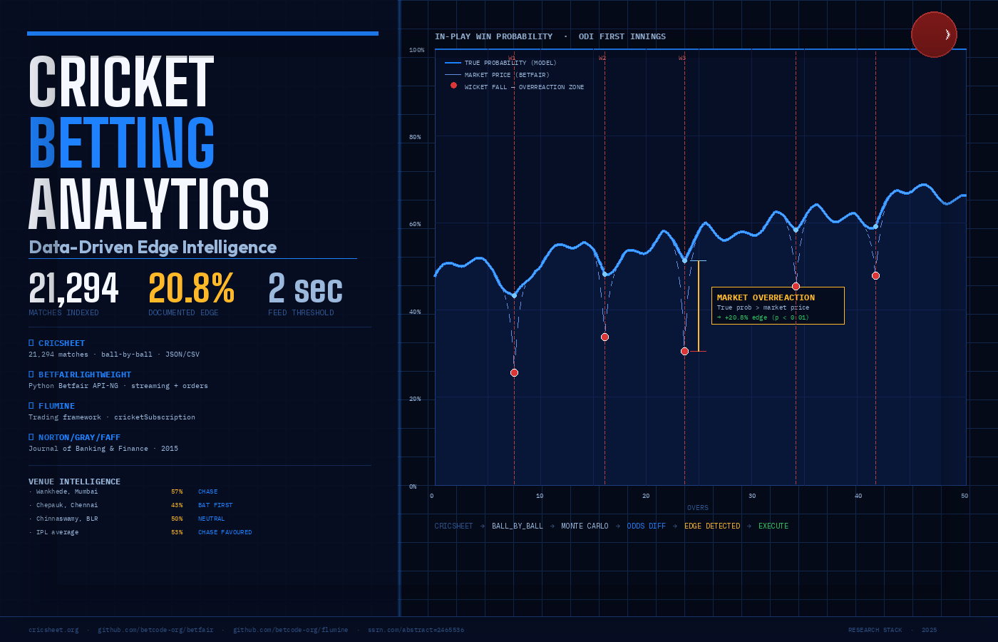 The mechanism: Betfair’s in-play market overreacts to wickets in the first innings. A wicket shifts odds harder than the actual probability warrants. The Monte Carlo simulation model they built consistently showed the market price diverging from true probability — and that gap is the trade.