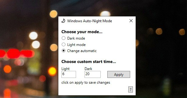 To address this problem, now there is an open-source program called “Windows Auto-Night Mode” that can be used to automatically switch between the dark mode and the light mode at pre-specified times. It is a very small program that can be used to manually enable the dark mode or the light mode as well as to auto-switch between the two.