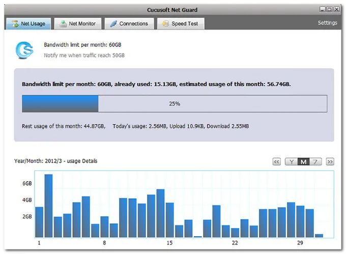 Net Guard may be the most popular free app available for monitoring internet usage on Windows OS as well as Android devices. It’s a great monthly internet traffic monitoring tool. By setting a traffic limit, Net Guard can help you avoid going over your monthly bandwidth threshold.