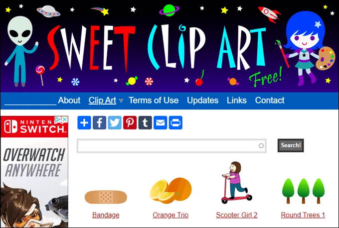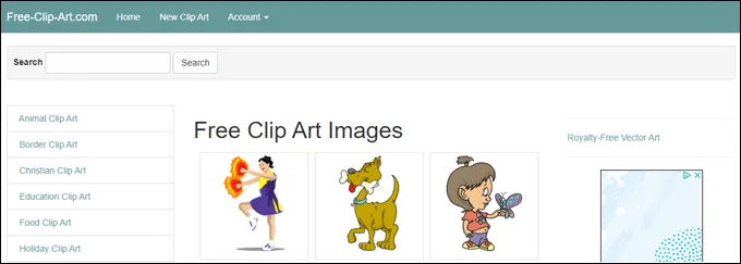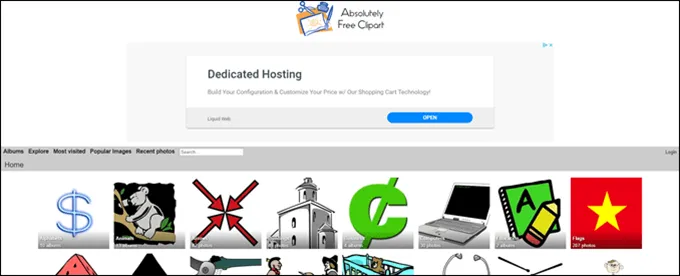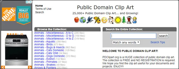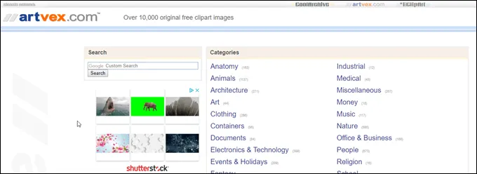 Artvex provides over 10,000 clipart images, but they aren’t the best quality and only available in .gif format. It’s royalty-free, but the link to their terms of use is dead. With 3 minor ads per page, it’s usable.