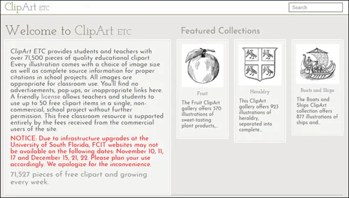 ClipArt ETC is a project of the University of South Florida. The quality is high, but all the images are line drawings. They come as smaller .gifs and larger as a .tiff file. For education, they’re free and attribution is requested.