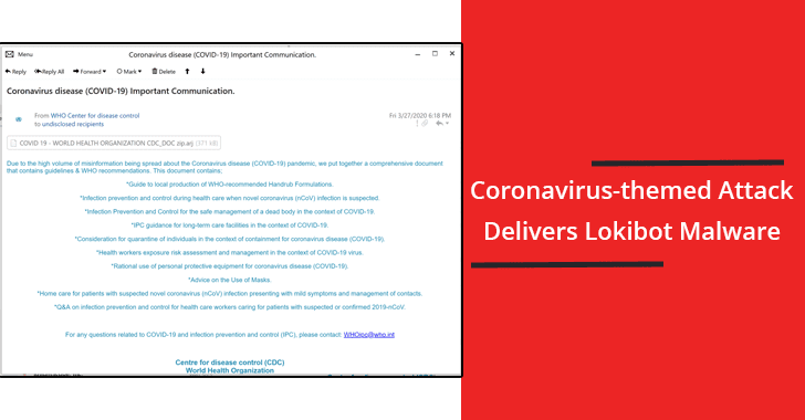A new campaign observed using COVID-19/Coronavirus-themed email appears to be coming from the World Health Organization (WHO) delivers the infamous Lokibot malware.