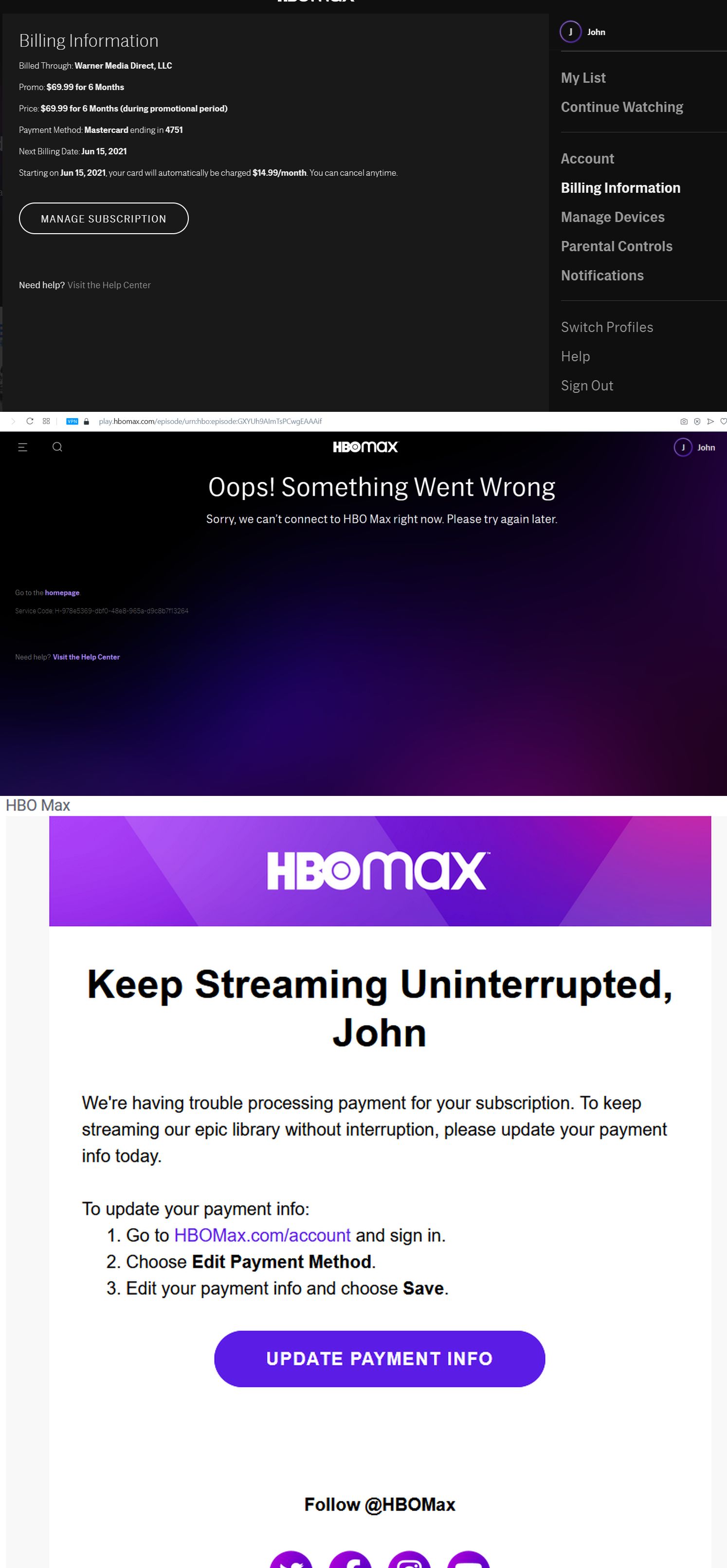 âWeâre having trouble processing payment for your subscription. To keep streaming our epic library without interruption, please update your payment info today.â