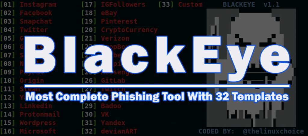BlackEye is a tool to generate phishing pages that target social media websites, with 32 templates and you can also customize your own template that will make you much easier to hack social media accounts. After redirecting a target to the phishing page, itβs easy to capture passwords to social media accounts harvested from unwitting victims.