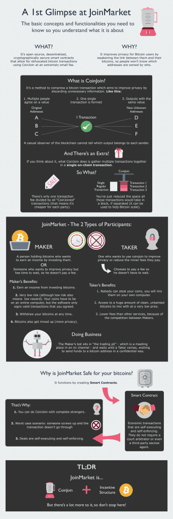 This infographic provides a gentle introduction to the workings of JoinMarket. Although a fairly simple concept, at the present state of development, JoinMarket represents a more complicated undertaking than sending coins through a mixing site:
