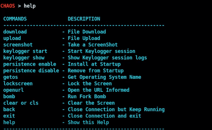 If we talk about the f eatures of the tool , they would be- reverse shell, Download files, Upload files, Open URL remotely, Get operating system name, Take screenshots, Keylogger, Persistent.