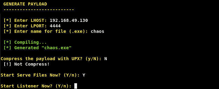 In the next step, it will ask you to start a listener for the payload. Type ‘Yes’ and enter the port you have chosen.