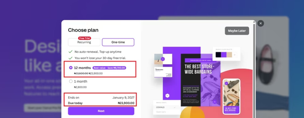 Canva Pro annual subscription via Nigeria VPN = 23,900 NGN (~£12.06)