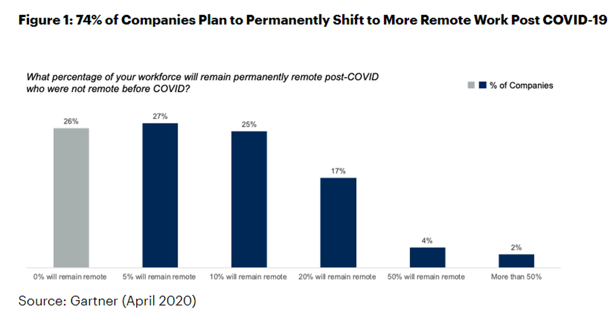 Gartner found that almost a quarter of respondents said they will move at least 20% of their on-site employees to remote work permanently. The research firm is taking the pulse of the COVID-19 CXO shifts in a series of surveys.