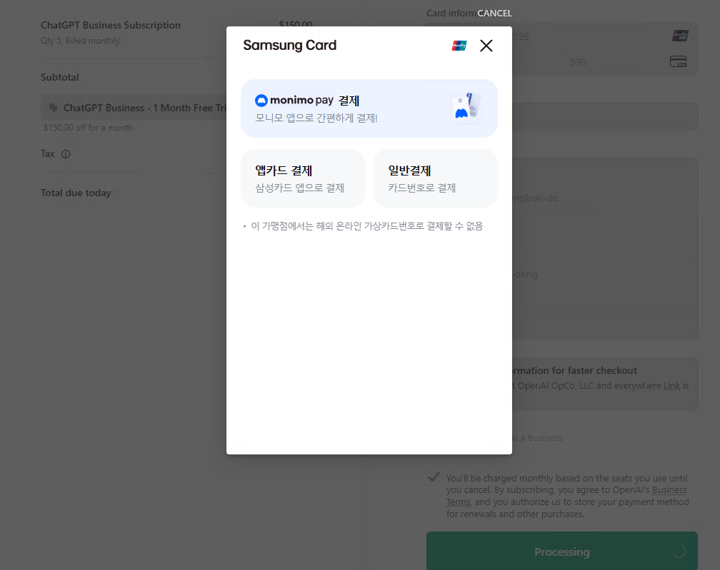 ChatGPT Business runs $25/user/month. This BIN triggers the 1-month enterprise trial through the Korean billing gateway.
