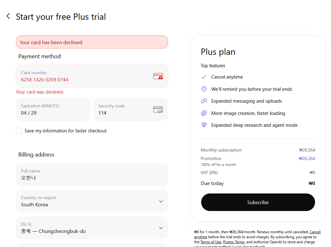 Your billing info should match with the ip address use any fake info generators online that has south korea as one of countries.