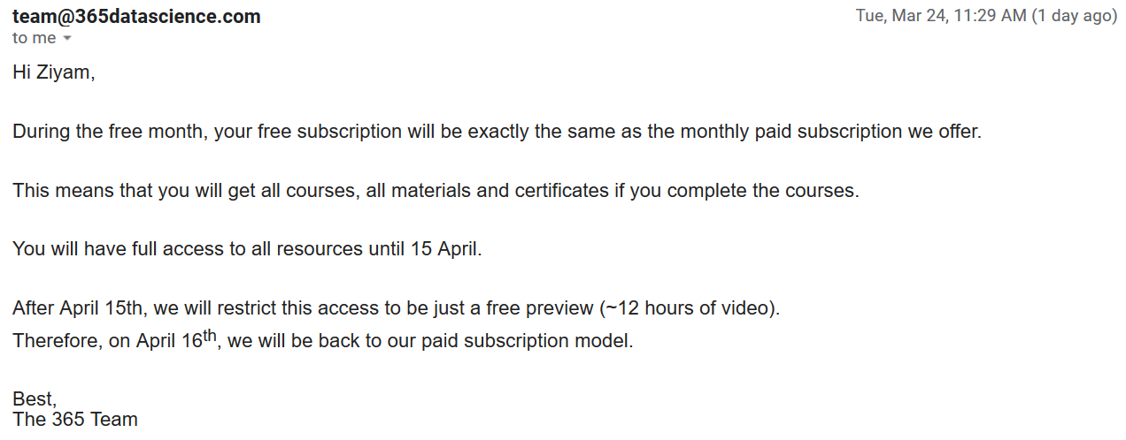 For this reason, we have decided to make the 365 Data Science Online Program free until April 15, 2020. 365 Data Science is a subscription based educational platform for aspiring data scientists. For the first time since our founding, we’re opening up all our content; 21 courses, 100 hours of video instruction and 600+ exercises entirely for free. We hope this will help aspiring data scientists pursue their studies and also contribute to the well-being of our global community during this challenging time.