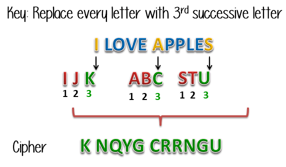 Let’s illustrate this with the aid of an example. Suppose you want to send the message “I LOVE APPLES”, you can replace every letter in the phrase with the third successive letter in the alphabet. The encrypted message will be “K NQXG CRRNGV”. To decrypt our message, we will have to go back three letters in the alphabet using the letter that we want to decrypt. The image below shows how the transformation is done.