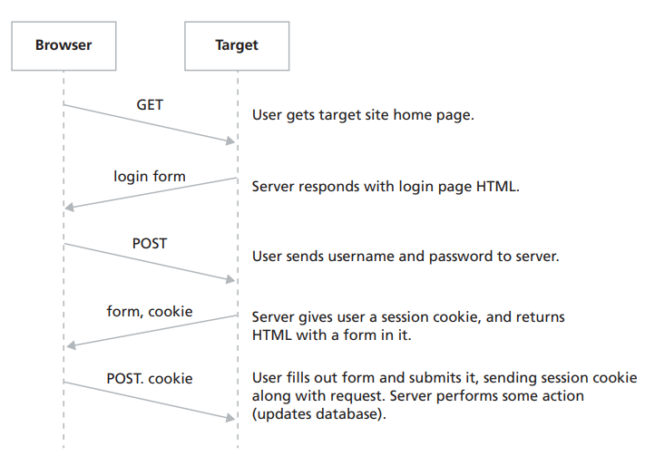 CSRF stands for cross-site request forgery. It’s also known as session riding or XSRF. CSRF takes advantage of the inherent statelessness of the web to simulate user actions on one website (the target site) from another website (the attacking site). Typically, CSRF will be used to perform actions of the attacker’s choosing using the victim’s authenticated session. If a victim has logged into the target site, an attacker can coerce the victim’s browser to perform actions on the target website. To go into more detail, let’s look at what happens when a user visits a website: